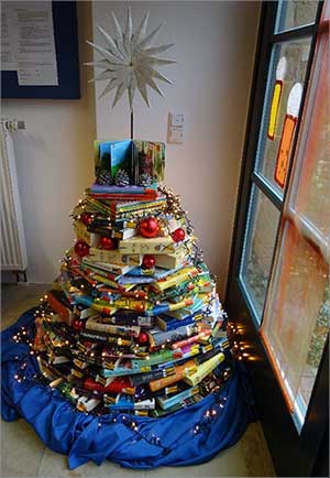 Dieser Weihnachtsbaum leuchtete im Dezember 2021 in der Bücherei Marienfeld. Er wurde komplett aus Büchern gebaut. Doch wie viele Bücher waren es? Es wurde fleißig gerätselt und die Gewinnerin Clara aus Gütersloh freute sich über ihr gewünschtes Buch "Hüterin des Waldes" von Mona Larch.